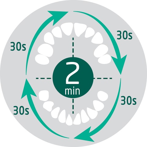 - Die Zahnbürste ändert ihre Vibration alle 30 Sekunden, damit Sie wissen, wann Sie den Zahnputzbereich wechseln sollten, und schaltet sich nach zwei Minuten automatisch ab.