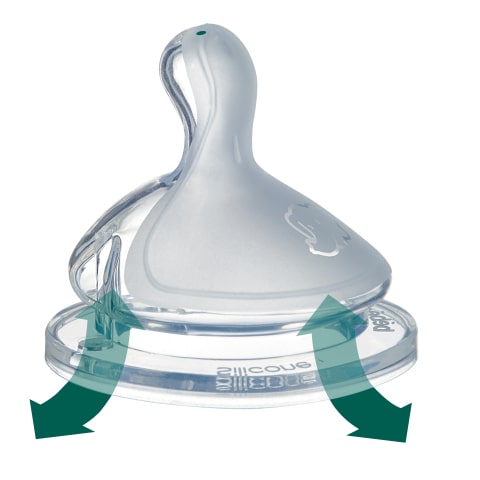 Jeder Sauger hat ein Ventilationssystem zur Regulierung der eintretenden Luft. Das sorgt für eine angenehmere Flaschenfütterung und reduziert Blähungen, Aufstoßen und Koliken.