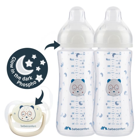 Zwei im Dunkeln leuchtende Ringe auf den Flaschen erleichtern das Flaschenfüttern in der Nacht und führen dich auch bei schwacher Beleuchtung. Der im Dunkeln leuchtende Schnuller ist auch einfach im Dunkeln zu finden.