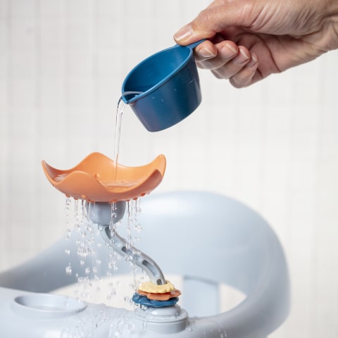 Das Aktivitätstablett mit einer Fischtasse, einem Sonnenmühlrad, einem Seesternsieb und Muschelringen bietet dem Baby viele Beschäftigungs- und Unterhaltungsmöglichkeiten während der Badezeit.