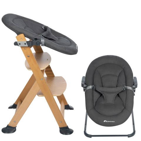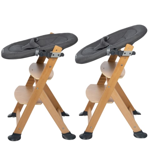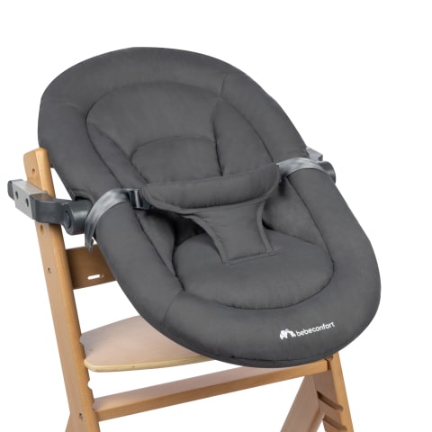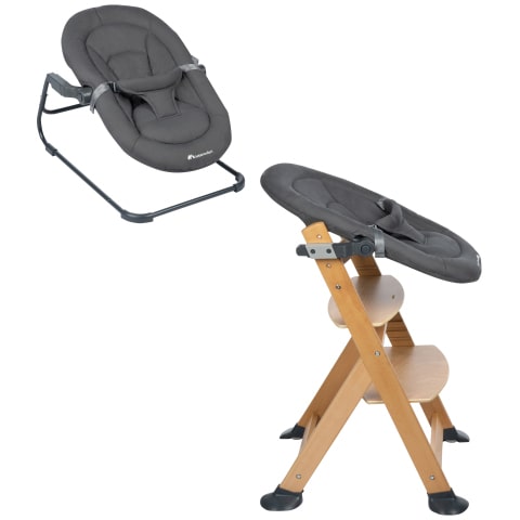 Die multifunktionale 2-in-1-Babywippe kann für Mahlzeiten mit der Familie am Timba Hochstuhl befestigt und anschließend wieder auf die Wippe eingeklickt werden.
